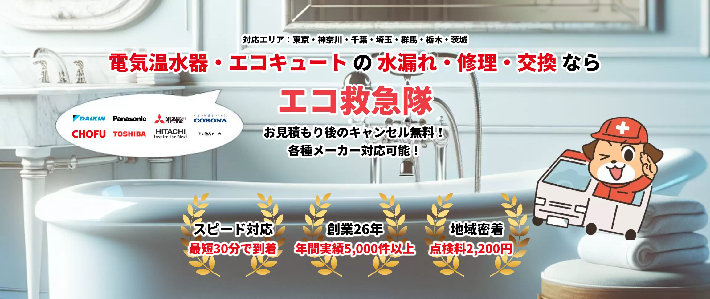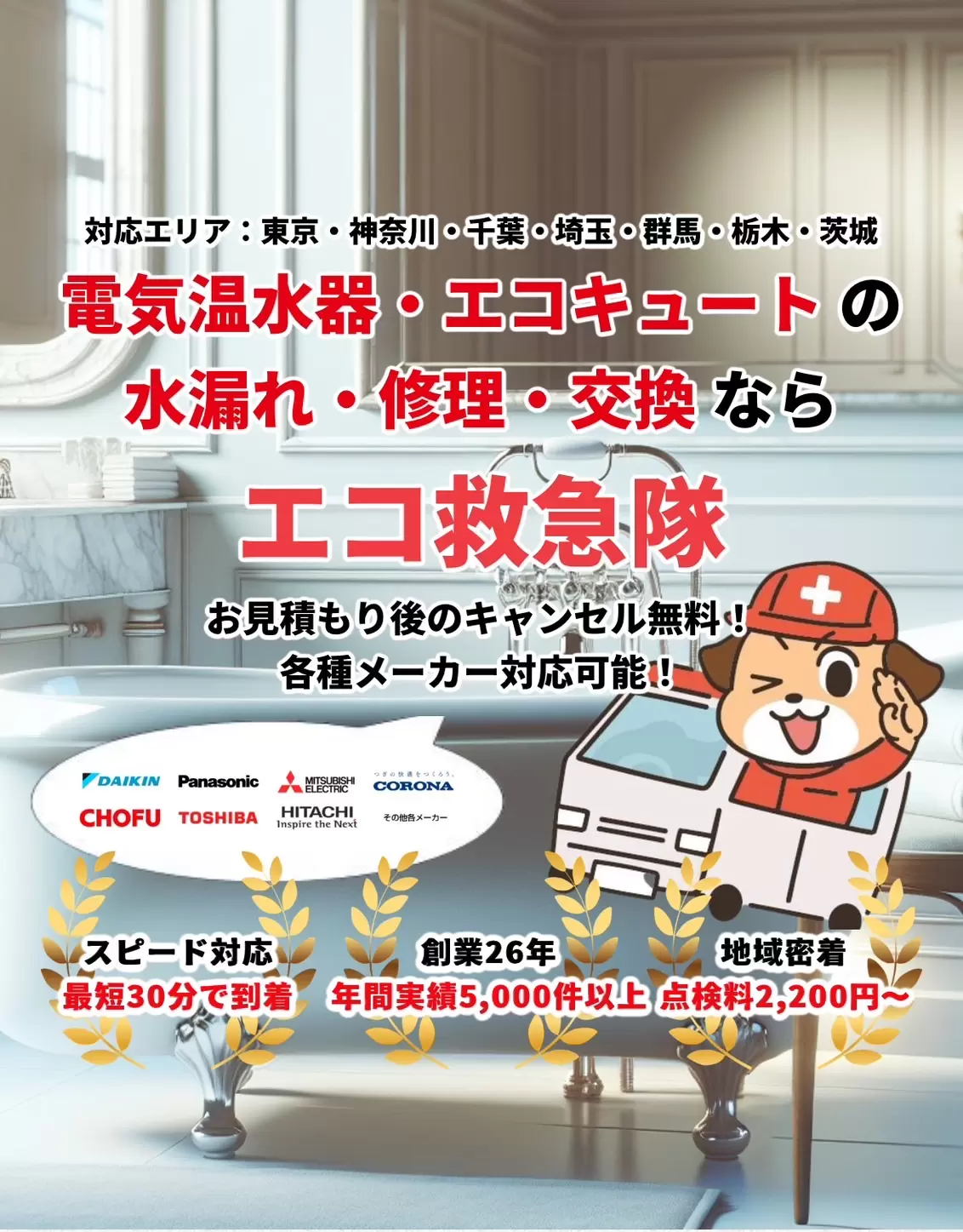 関東地方地域密着なのでスピード対応が可能です。最短30分で到着最短30分修理し当日中にお湯が出るようになります。